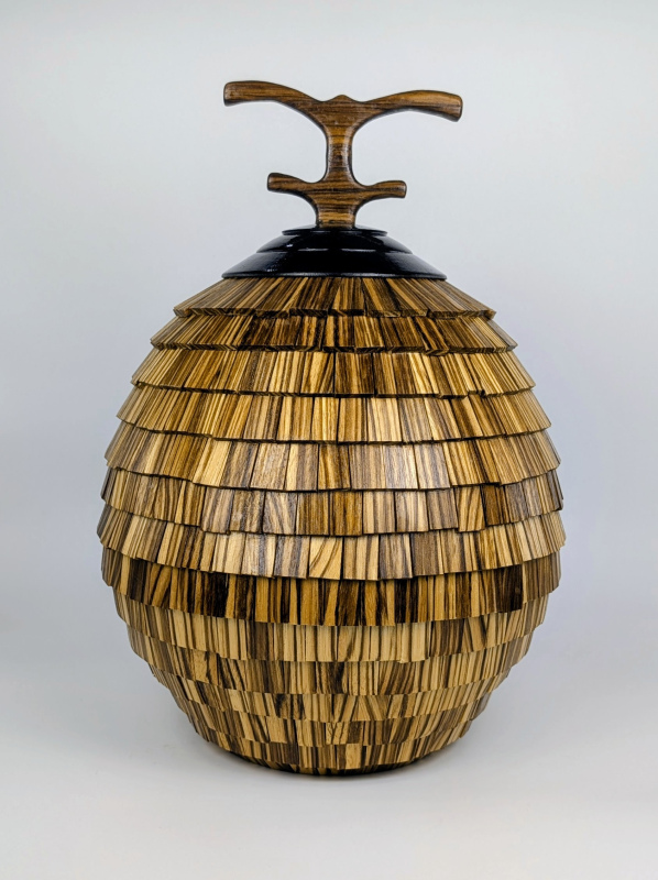 Poplar segmented vessel with Zebrawood embellishments (shingles) and a carved Zebrawood finial.