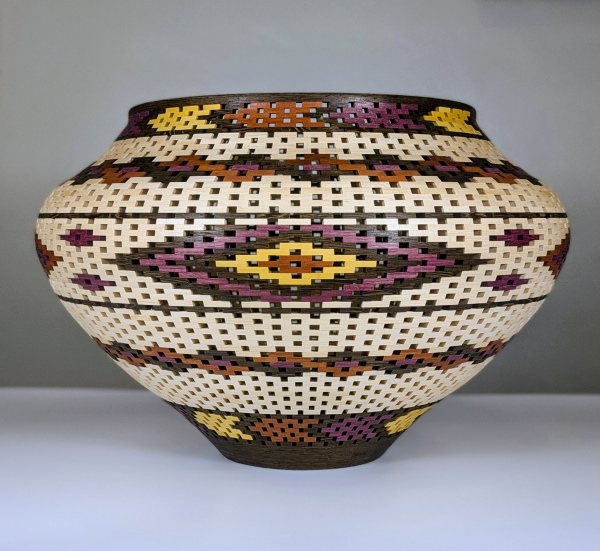 Made from over 3100 pieces of Bloodwood, Maple, Purpleheart, Wenge and Yellowheart, individually glued - one piece at a time.