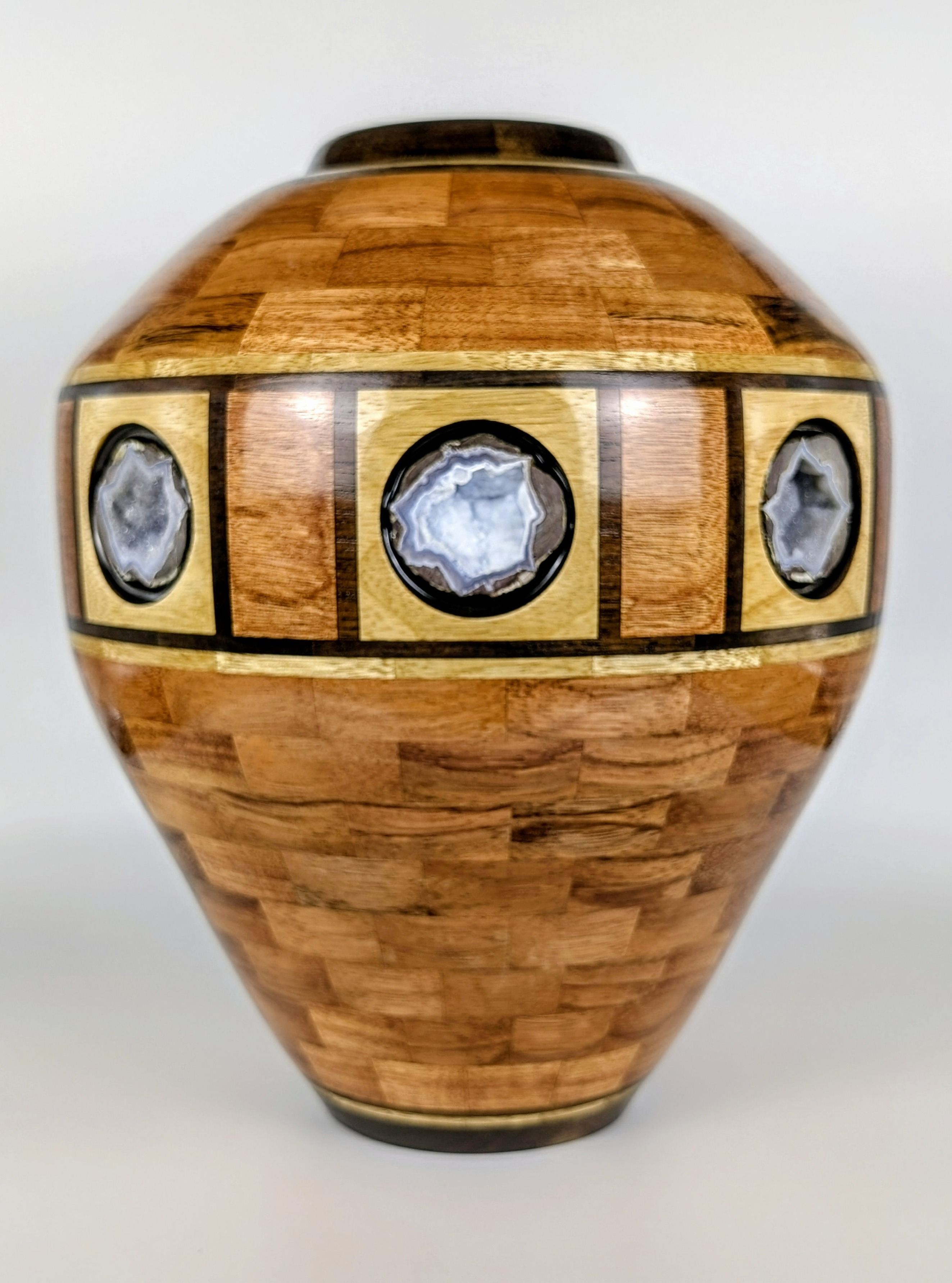 Every vessel is a labor of love, often requiring weeks and up to 100 hours of meticulous work. I begin by envisioning a shape, then designing a pattern that harmonizes with it. Each piece of wood is milled to precise thickness, cut to exact dimensions, and joined one by one. Some vessels contain more than 3,000 individual pieces, all assembled without lasers or CNC machines—only patience, handwork, and respect for the material.